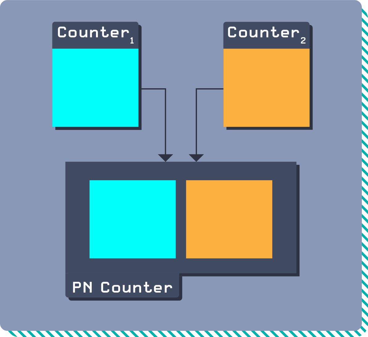 A simple example of CRDT composition is a Positive Negative Counter, or PN Counter. A PN Counter combines two counters: one counts positive changes and one counts negative changes. The PN Counter then combines these two counters to give the net current value.