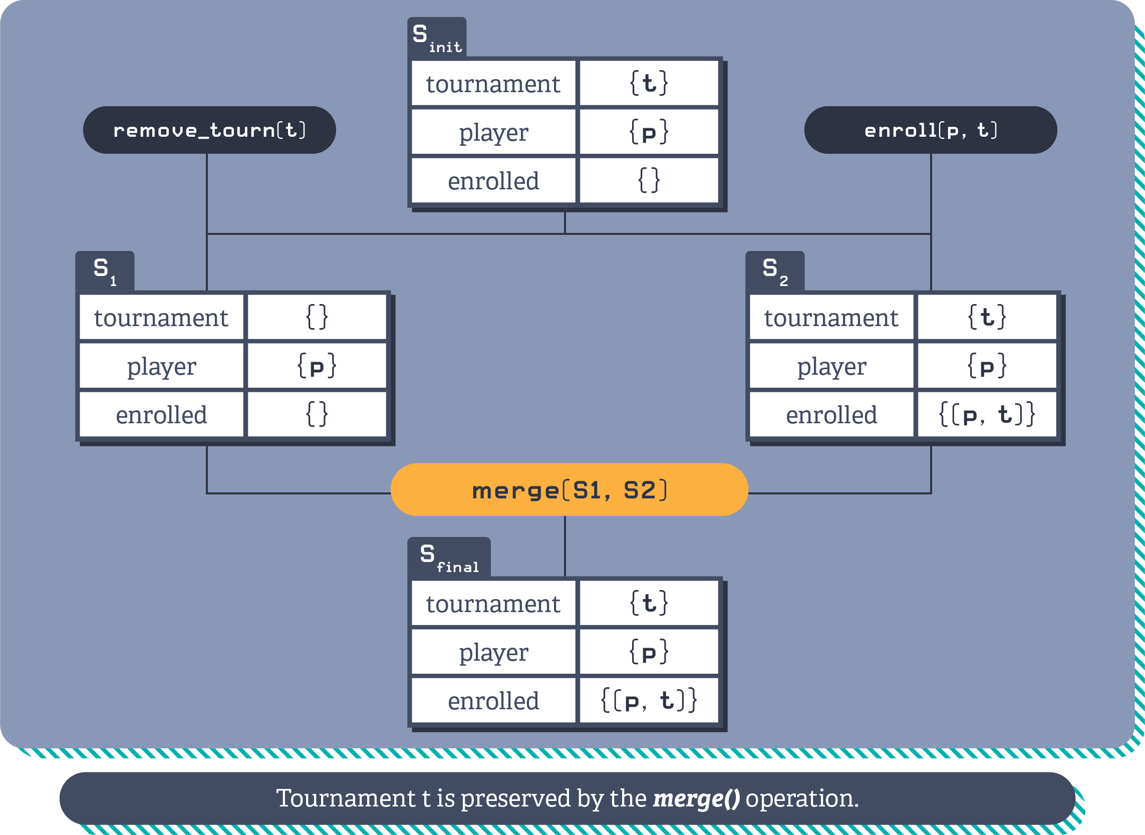 Compensations can offer a solution. For example, by adding a touch operation to the enrol player operation. By adding the additional touch operation into the transaction where the player is being enrolled, it can ensure that the tournament still exists, even when merged with a concurrent transaction removing the tournament, if the set of tournaments follows add-win semantics.