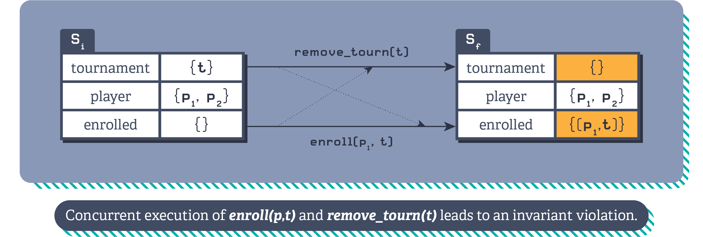 Referential integrity poses challenges when it comes to concurrent operations, because one operation might delete a row at the same time that another row is being added to an associated table that refers to it. A classic example is a player being enrolled in a tournament concurrently to the tournament being deleted.